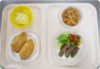月曜日にはうどんや蕎麦、夏には冷麺など麺類の日、金曜日はカレーライス、丼ものなどの変わりごはんを用意し、年間21回程度予定している行事食は、大変患者さまに喜ばれています。また、入院中にお誕生日を迎えられた患者様に、メッセージカードを添えて、バースデー膳をご用意しています(病状などにより、提供できない場合もございます)。